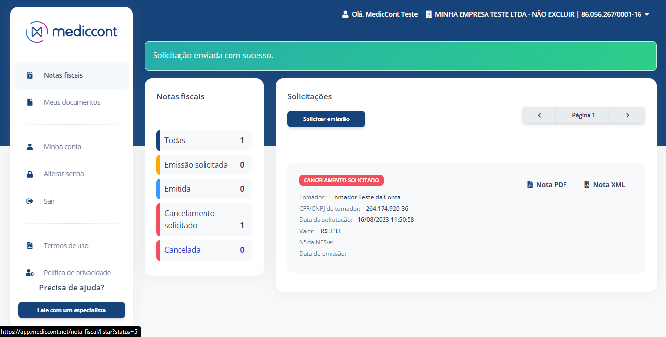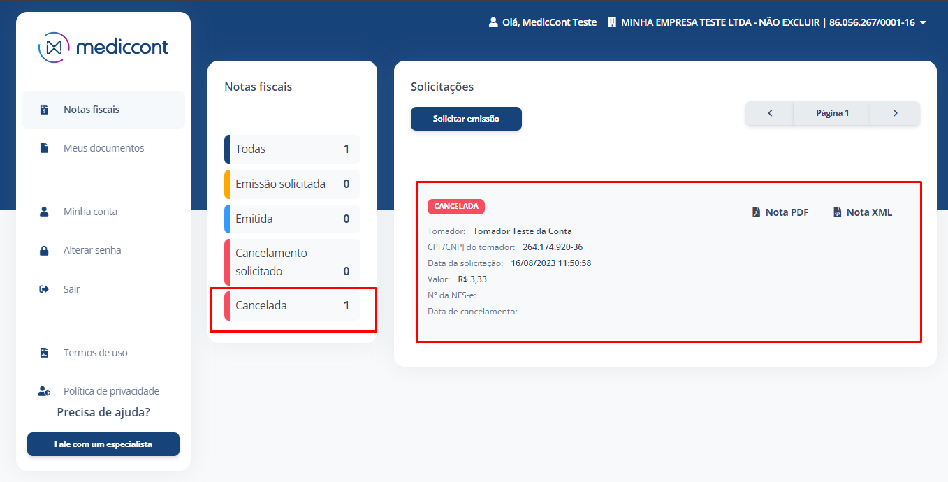 Quando seu contador realizar o cancelamento, o status da sua nota fiscal mudará para “Cancelada“.