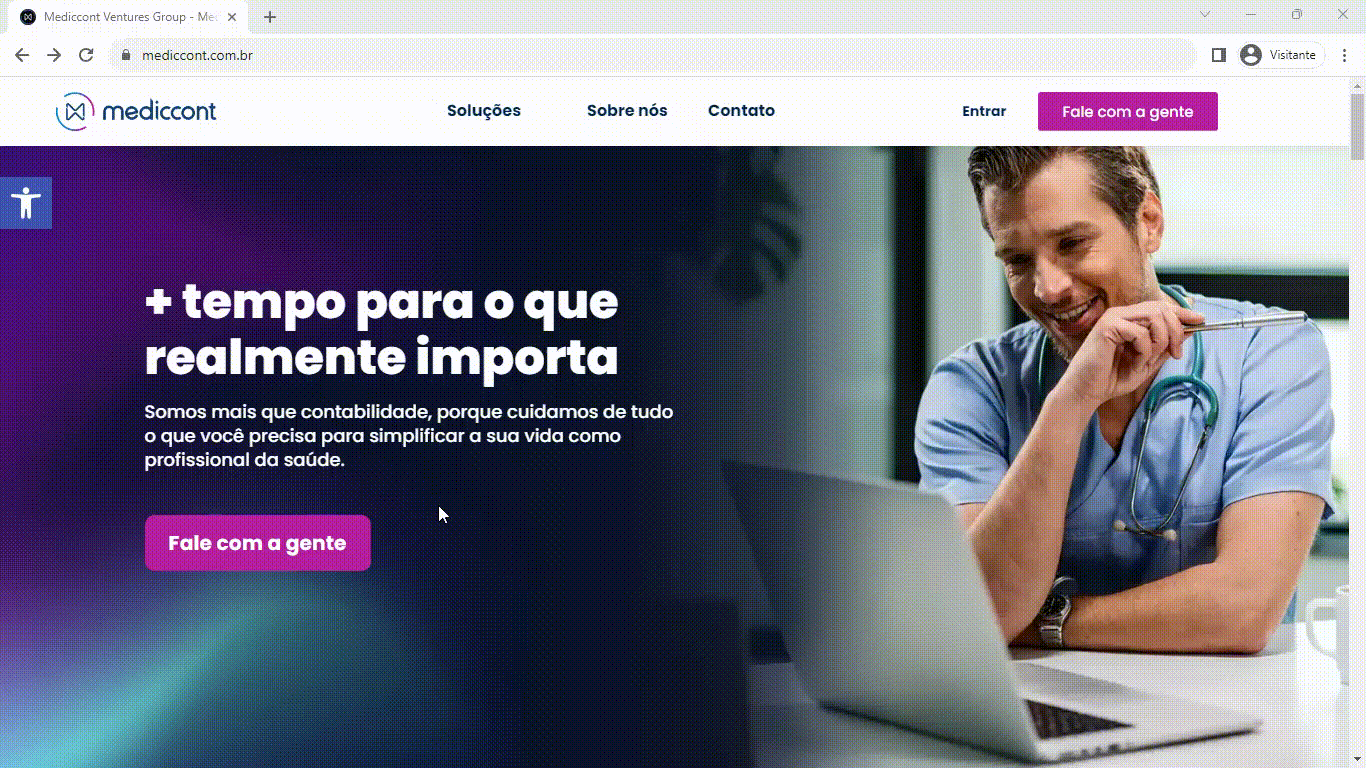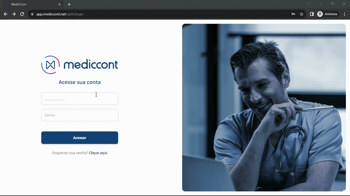 Você pode acessar a plataforma através do nosso site. No canto superior direito do site, clique no botão “Entrar”, e você será redirecionado para a plataforma Mediccont. Em seguida, entre com suas informações de acesso.