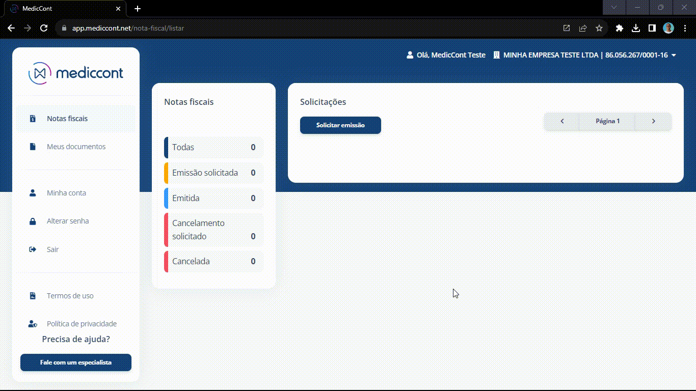 A nova plataforma dá mais segurança e facilita o controle das atividades da sua empresa com a Mediccont. Na plataforma você terá acesso às principais informações da sua PJ, como os documentos da empresa e as suas solicitações de emissão de notas fiscais para seu contador.