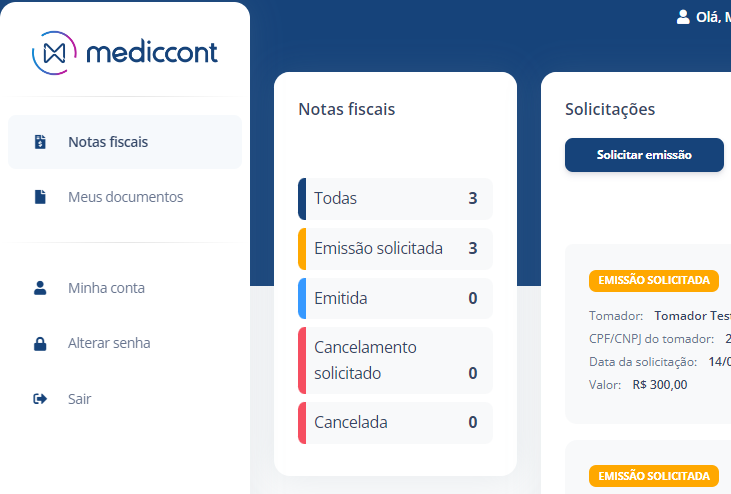 Emissão solicitada: é o primeiro passo para enviar sua solicitação de nota fiscal para a contabilidade.
